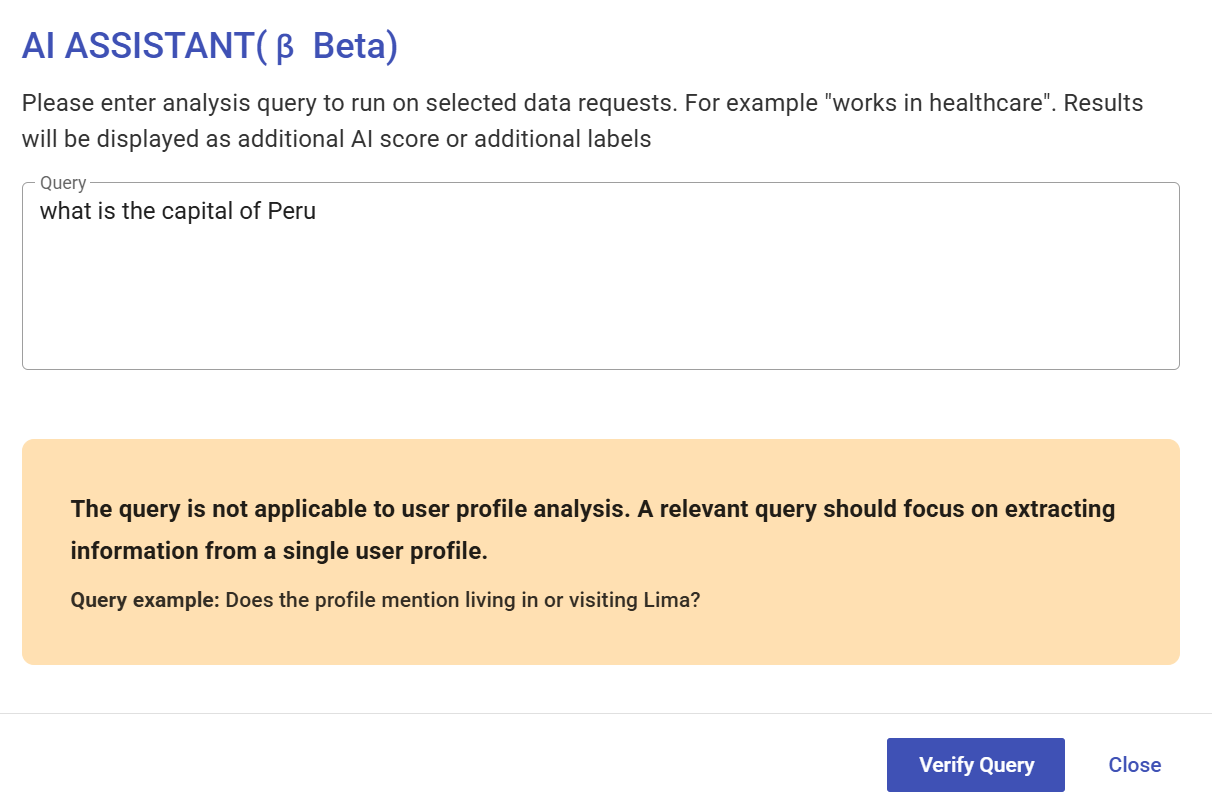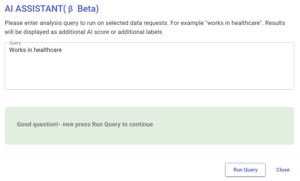 Enter your query to run on the selected data requests. For example "works in healthcare". Then click Verify Query.