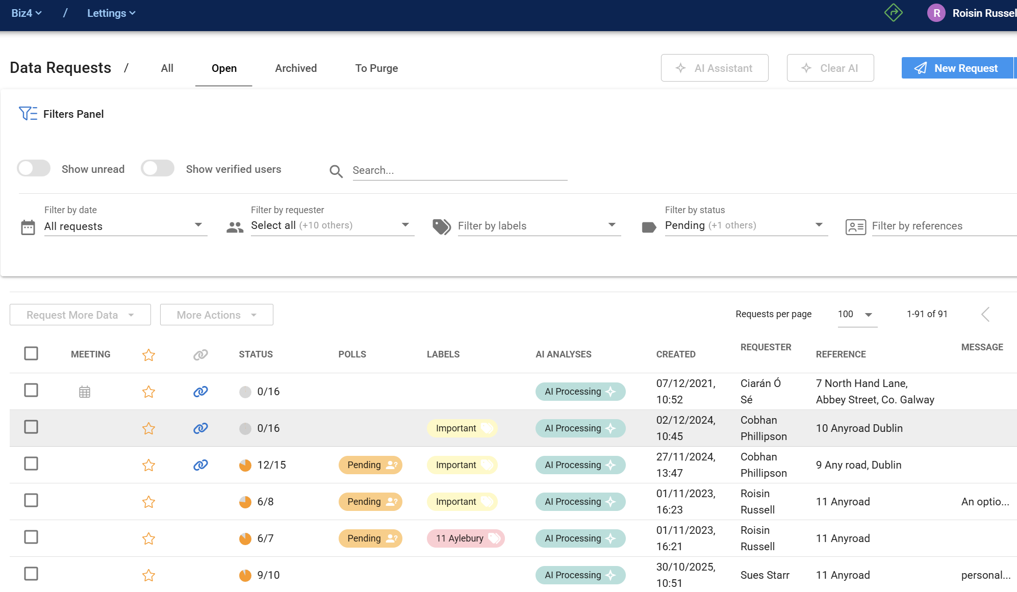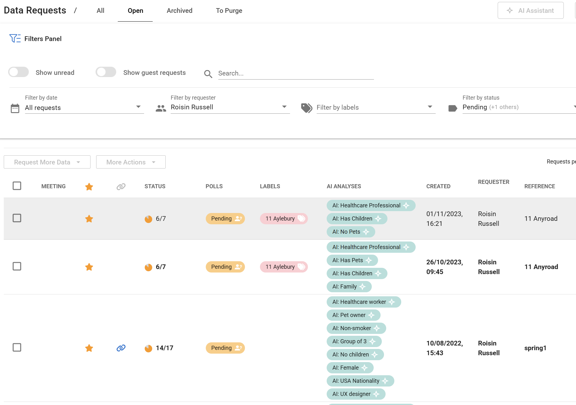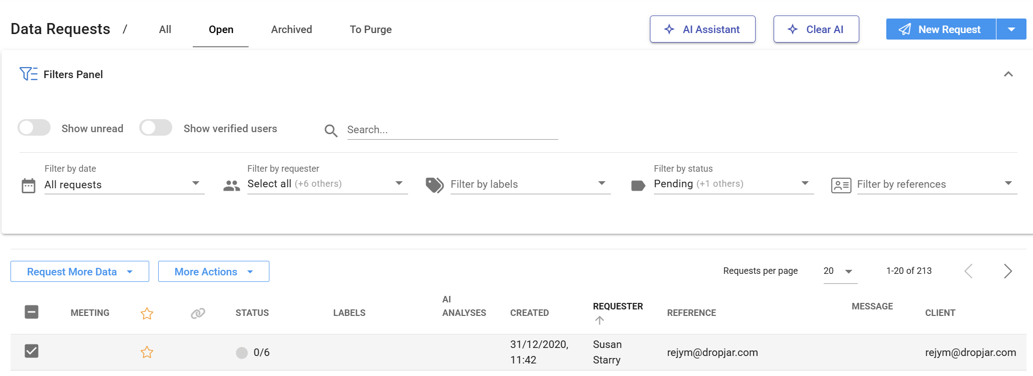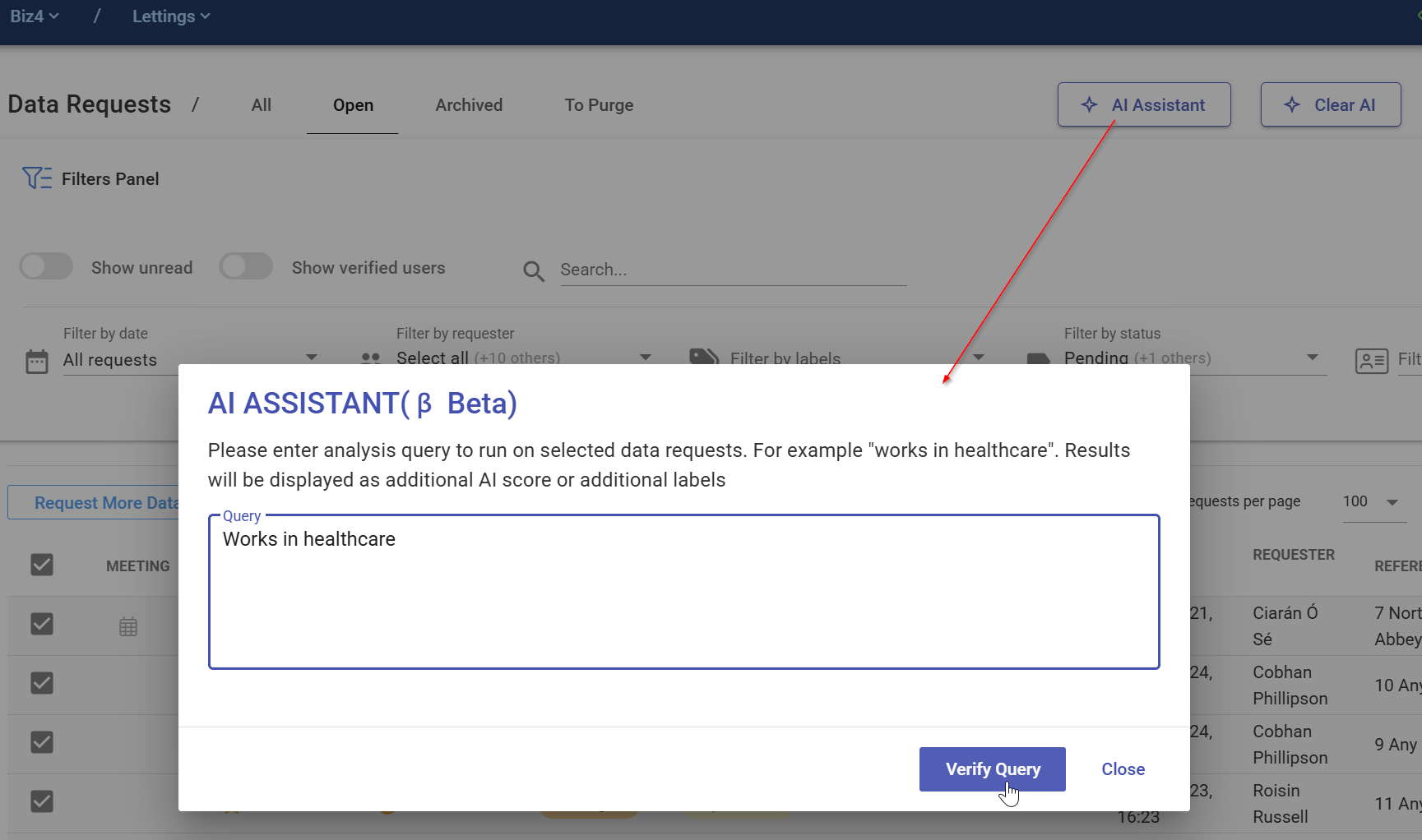 To start- select one or more profiles from the Data Requests page. You can select all profiles on the page if necessary. The AI Assistant button will now become active.