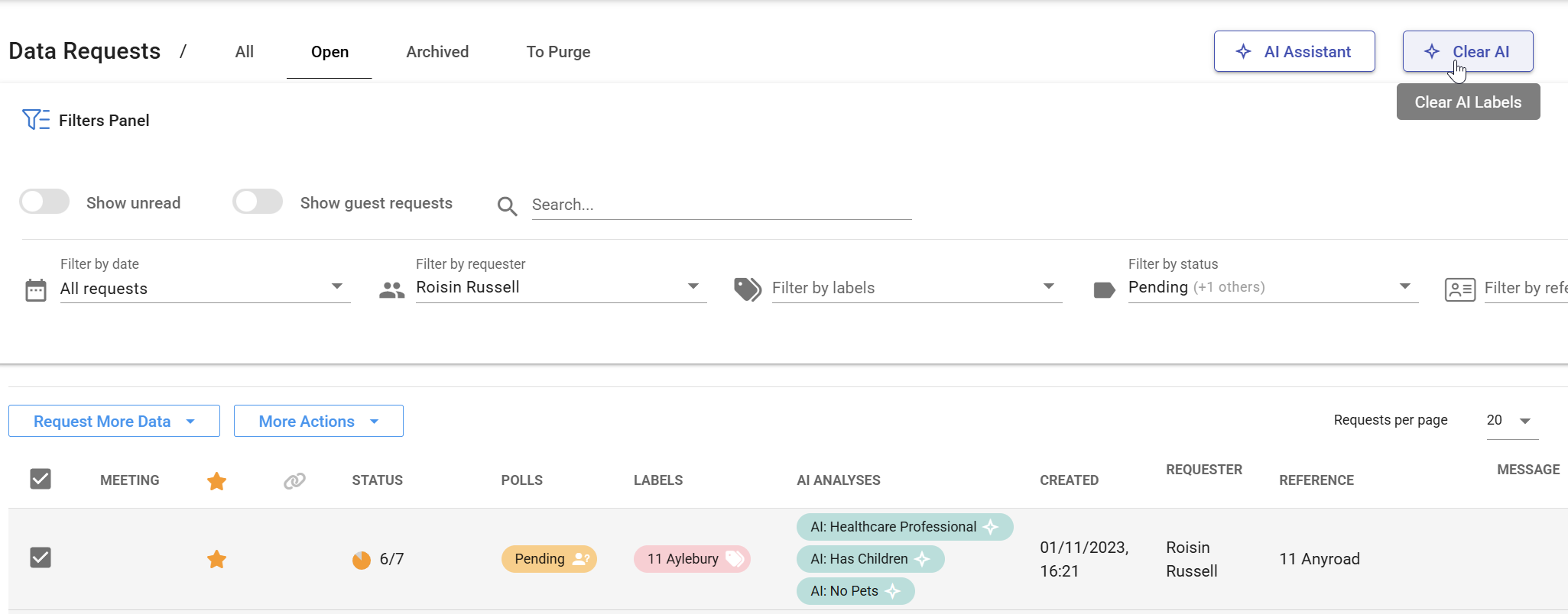 You can select profiles and then use the Clear AI button to remove these labels if you wish to use another query.