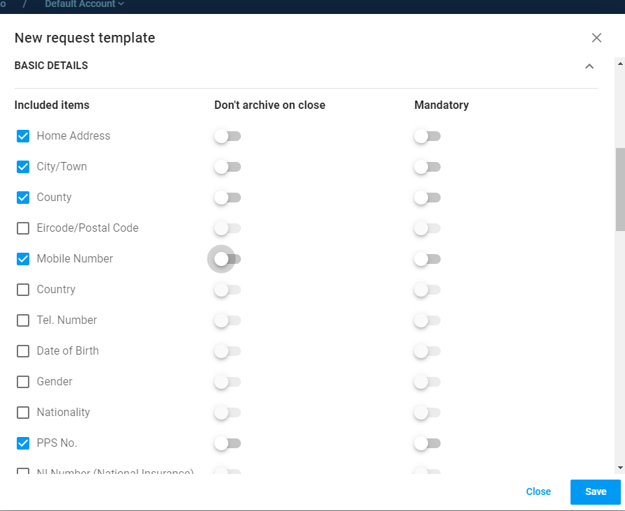 Choose the Basic Details required for the template using the drop-down menu. Note: By default, all information is not required. You need to select what you want to include. You can add a custom item here as for any profile template. You can also choose ‘Don’t archive on close’ option if you want to ensure this data item is never saved once the request is closed. You can also select Mandatory which means the app user must supply this item.