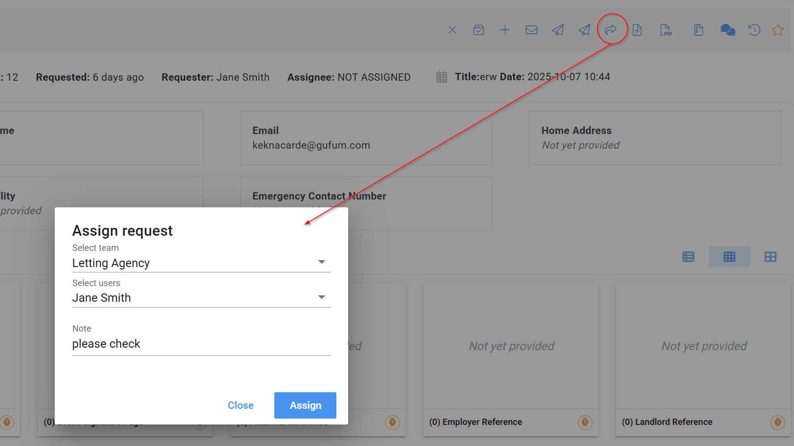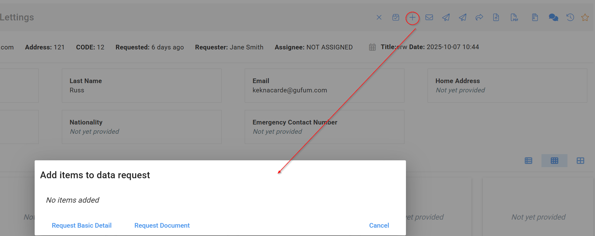 User can select to request an additional detail (such as phone number) or an additional document and include an attachment as well in outgoing email.